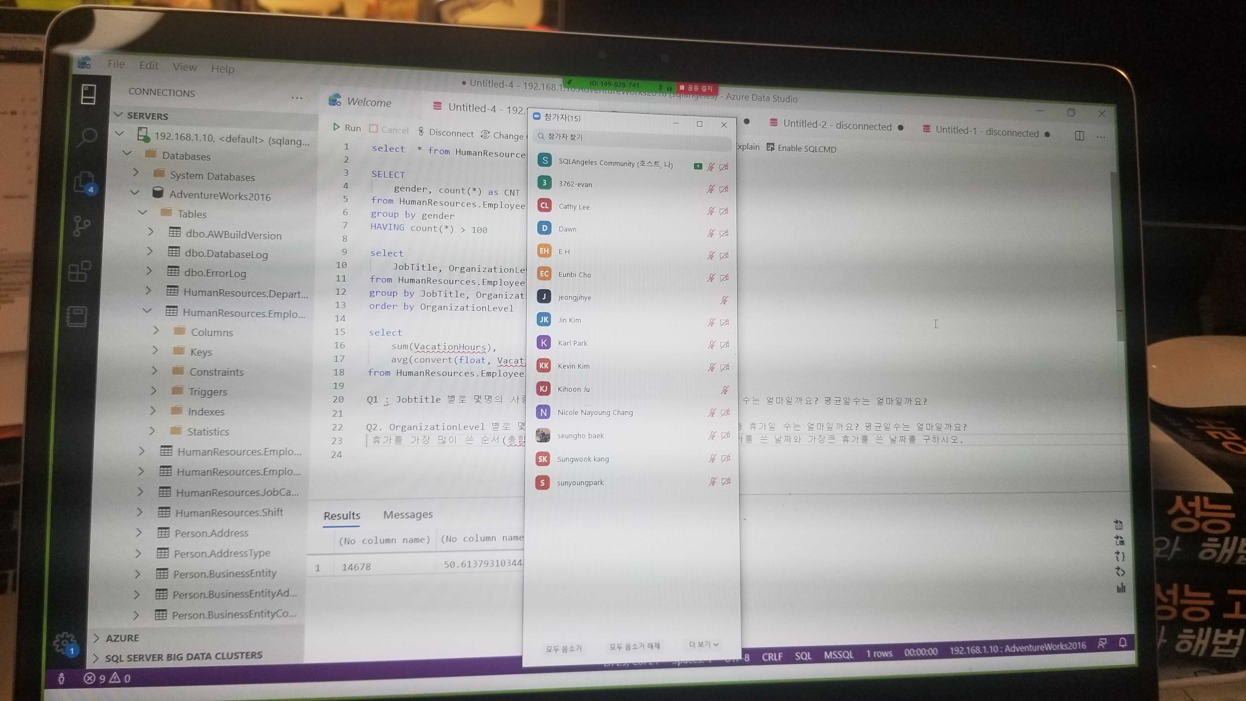 화면을 공유하면서 쿼리에 대한 설명과 함께 퀴즈도 풀어 봅니다.